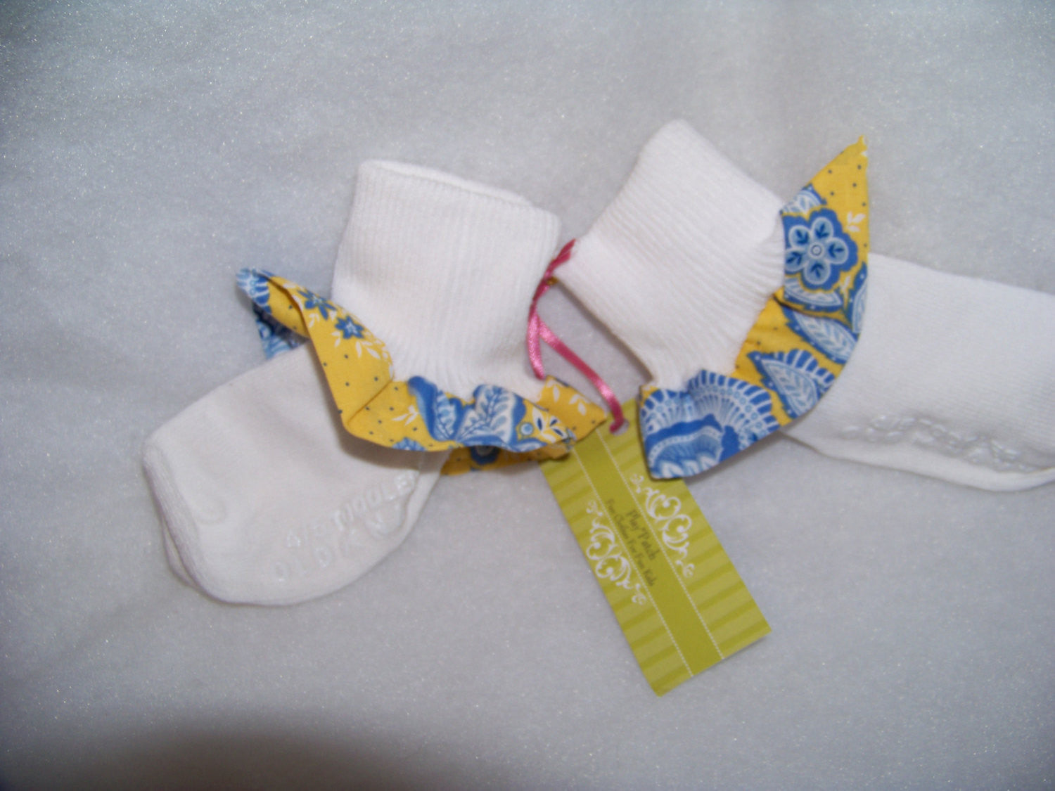 These socks would be a cute addition to your little ones wardrobe. The socks are white old navy size 4/5 toddler socks embelished with a flower and polks dot ruffle.